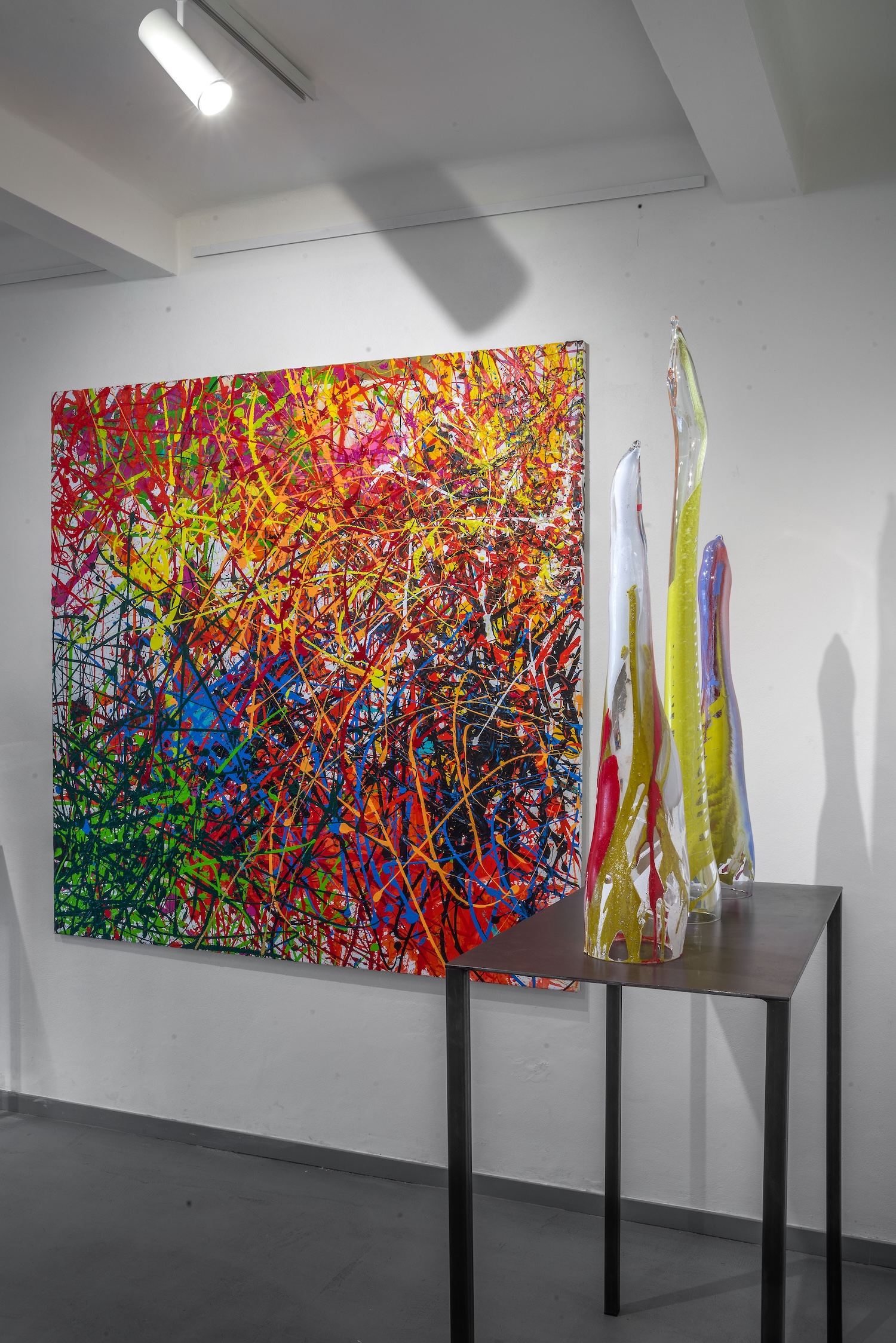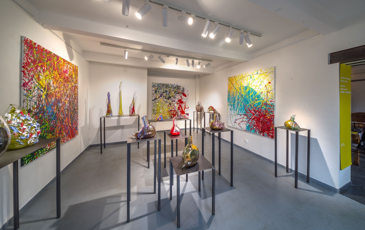 Těžiště výstavy sice leží v materiálu skla, což odpovídá dlouhodobému zaměření galerie Kuzebauch, důležitou roli však hrají i Kopeckého expresivní malby. Ty vznikají převážně na jeho chatě během jarních a letních měsíců a nesou v sobě bezprostřednost momentálního prožitku. Na první pohled mohou evokovat gestickou malbu v duchu Jacksona Pollocka, Kopecký však k tomuto typu vyjádření přistupuje jinak. Nejde o systematickou metodu, ale o spontánní reakci na vnitřní stav a záznam nálady v daném okamžiku. Malby tak představují klíč k pochopení autorova uvažování o barvě, vrstvení a gestu.